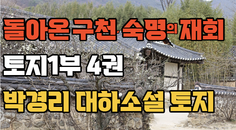 《토지》 1부 4권. 최서희는 역병과 흉년을 겪으며 냉철한 리더로 완성되고, 을사보호조약이라는 민족적 비극 앞에서 새로운 사명을 부여받습니다. 그녀의 개인적인 복수는 이제 민족의 독립이라는 거대한 대의로 승화됩니다. 다음 편, **《토지 2부 (1권): 격변의 시대, 운명의 족쇄》**에서 그녀의 투쟁은 계속됩니다. 박경리 작가님의 대하소설 《토지》와 함께 해 주십시오.